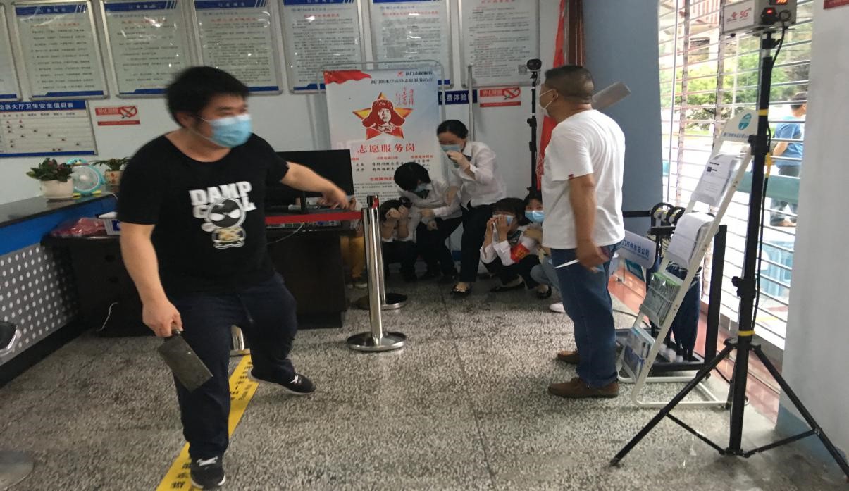 “搶劫!都老實點!雙手抱頭!蹲旁邊去……”兩蒙面男子持刀沖進了收費中心龍泉營業(yè)廳。原來,一場別開生面的防盜搶演練正在進行。