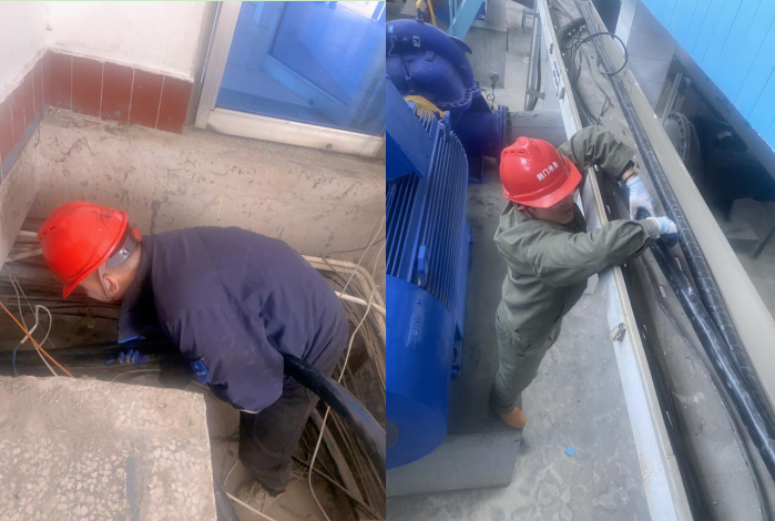 從中壓泵房變頻柜敷設(shè)200多米的電纜至送水泵房泵機(jī),途徑1米高的電纜隧道和5米高的電纜夾層,由于隧道內(nèi)部空間狹小,人在其中只能彎著腰蹲著作業(yè),多處轉(zhuǎn)彎,也給工作帶來不小的難度,但大家充分發(fā)揮水務(wù)人“特別能戰(zhàn)斗”的精神,齊心協(xié)力,最終歷時(shí)3小時(shí)完成任務(wù)。