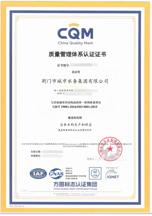 圖為市水務(wù)集團(tuán)通過(guò)質(zhì)量管理體系認(rèn)證