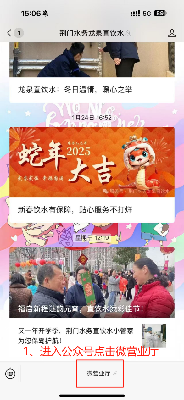 或者打開微信,點擊右上角的“+”,選擇“添加朋友”,在搜索框中輸入“荊門水務龍泉直飲水”,點擊搜索,再“關注”。