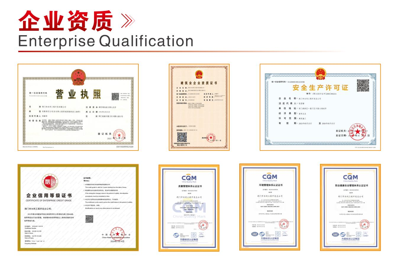 企業(yè)資質(zhì)與榮譽(yù)是企業(yè)綜合實(shí)力的“通行證”。水利公司具有水利水電、建筑工程、市政公用工程三項(xiàng)施工總承包貳級資質(zhì)和環(huán)保工程專業(yè)承包貳級資質(zhì),2024年12月成功通過高新技術(shù)企業(yè)認(rèn)定。主要從事水利水電工程、建筑工程、市政公用工程、環(huán)保工程、工程質(zhì)量檢驗(yàn)檢測服務(wù)等,綜合實(shí)力躋身省內(nèi)水利施工行業(yè)第一方陣。