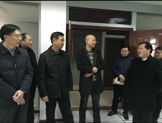 1月29日下午,副市長王良新(左一)、政協(xié)副主席舒行飚(右二)等領導在市住建委黨委書記、主任楊劍(左三)、公司黨委書記、總經(jīng)理陳永根(左四)陪同下親切看望慰問春節(jié)期間仍然堅守崗位的供水員工。圖為在調(diào)度監(jiān)控中心時的情景。