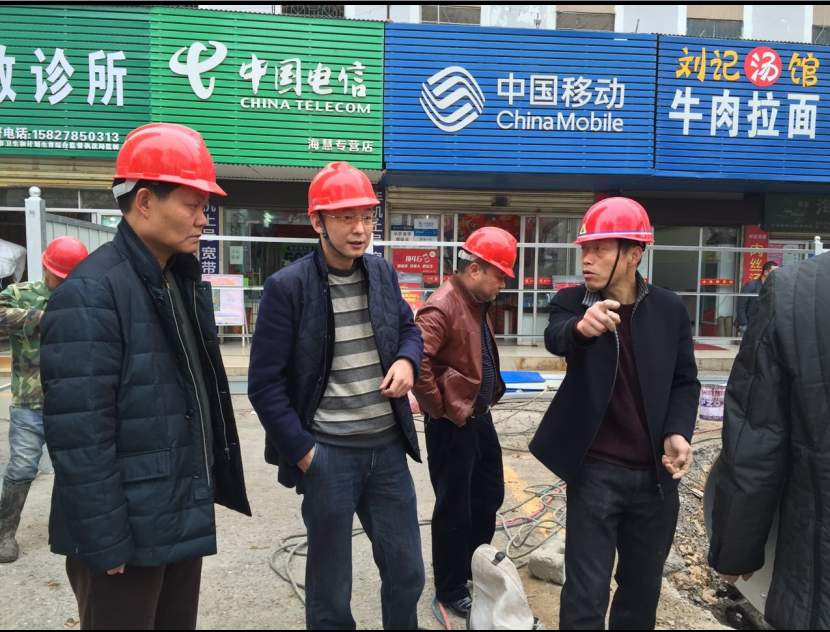 荊門市供水總公司黨委書記、總經(jīng)理陳永根(左二)等在象山大道海慧地下通道供水管道施工現(xiàn)場(chǎng)。
